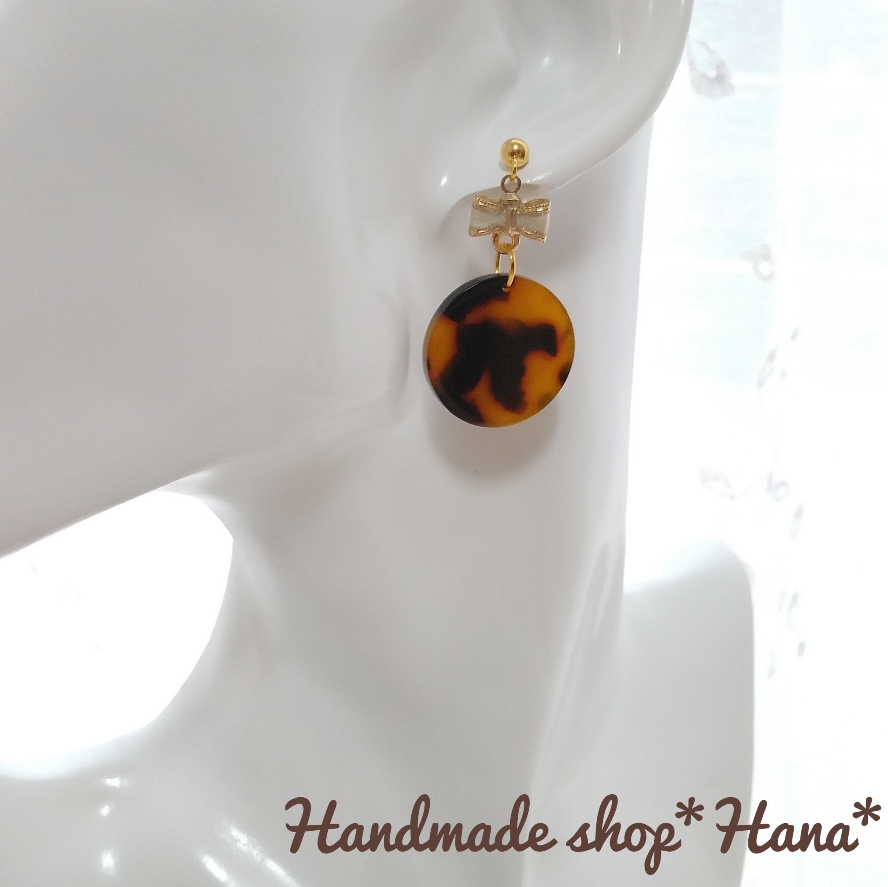 夏、秋の定番、べっ甲とかわいいリボンチャームでお洒落かわいいピアスができあがりました。