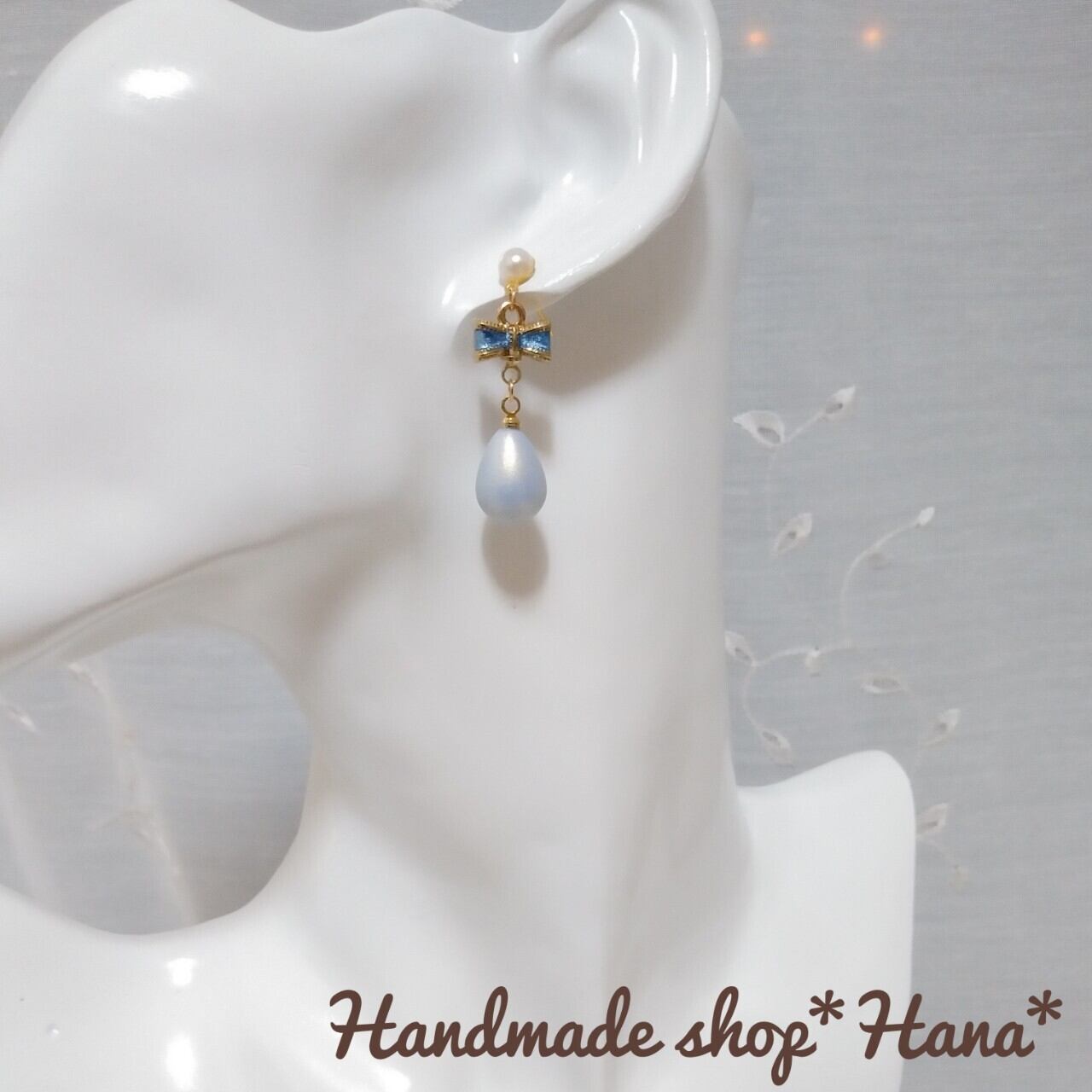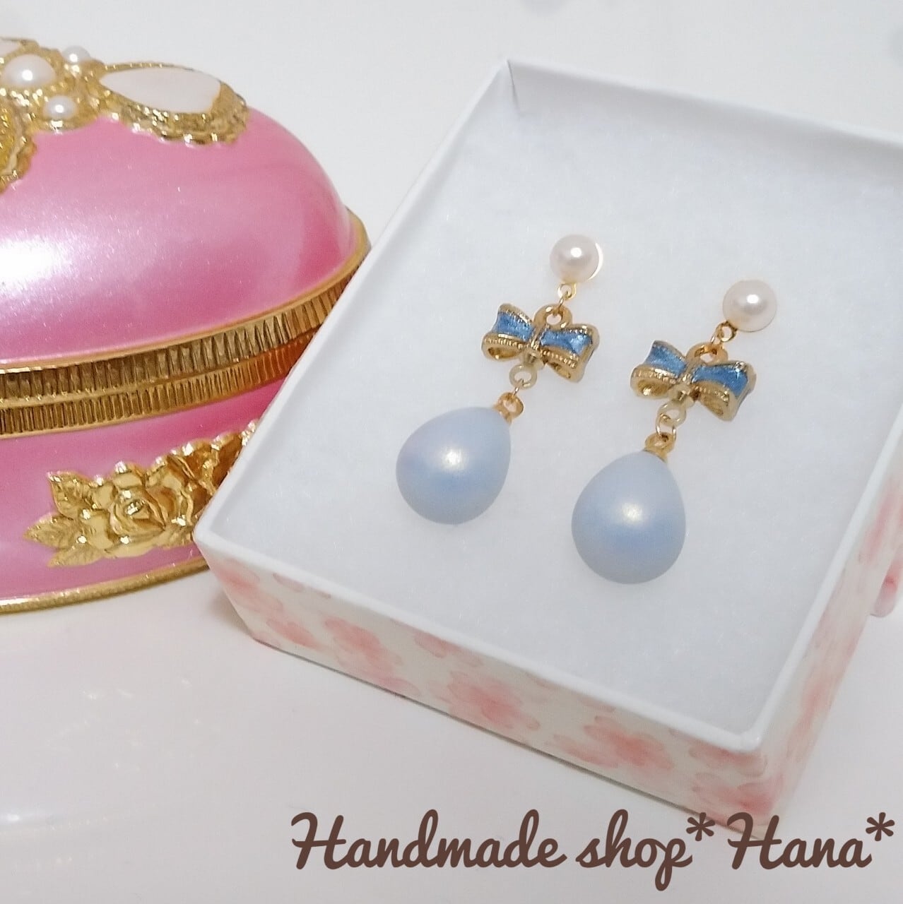 人魚の涙を想像したら、きっとパールのしずくのような美しい涙なんだろうなと思いこのピアスができあがりました!パステルカラーのしずくとリボンのとてもかわいいピアスです。