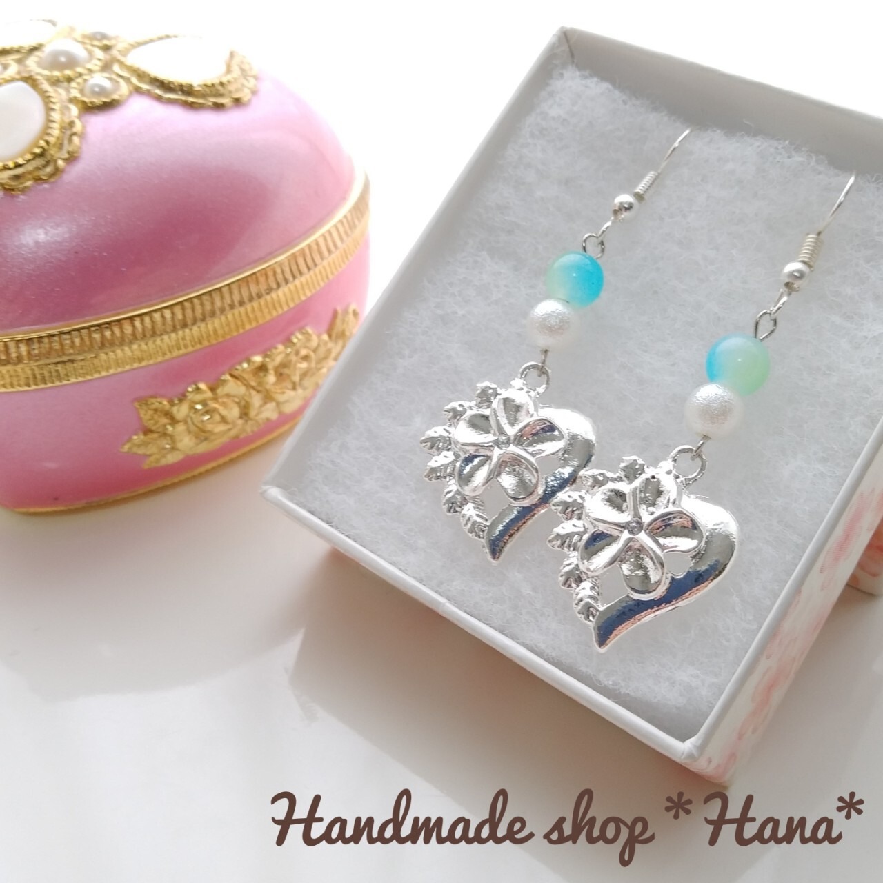 ハワイのお花プルメリアをモチーフに制作しました。涼しげでかわいいプルメリアのチャームが夏を感じさせてくれます♪ハワイがお好きな方にぴったりです!