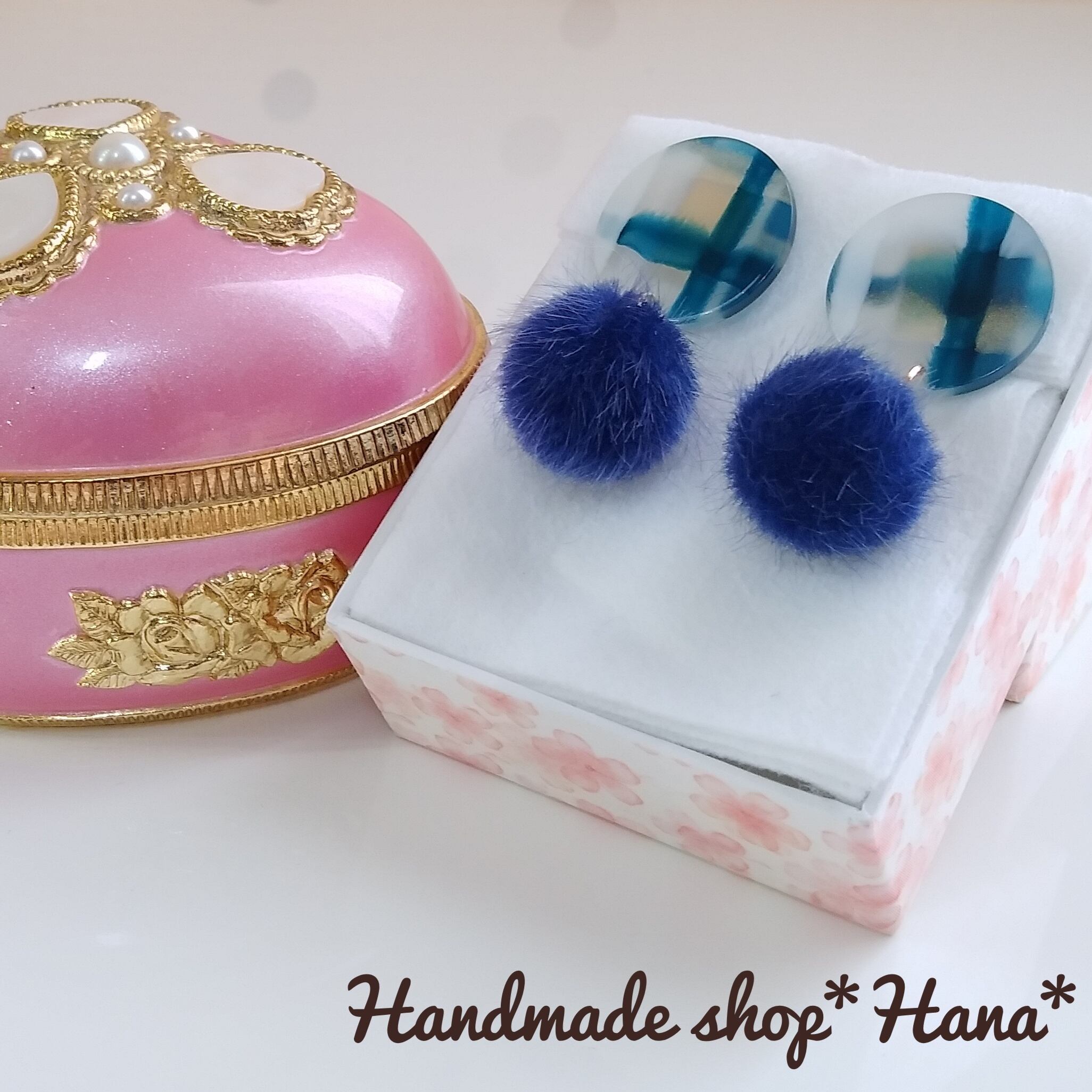 チェック柄べっ甲×フェイクファーイヤリング(ブルー)