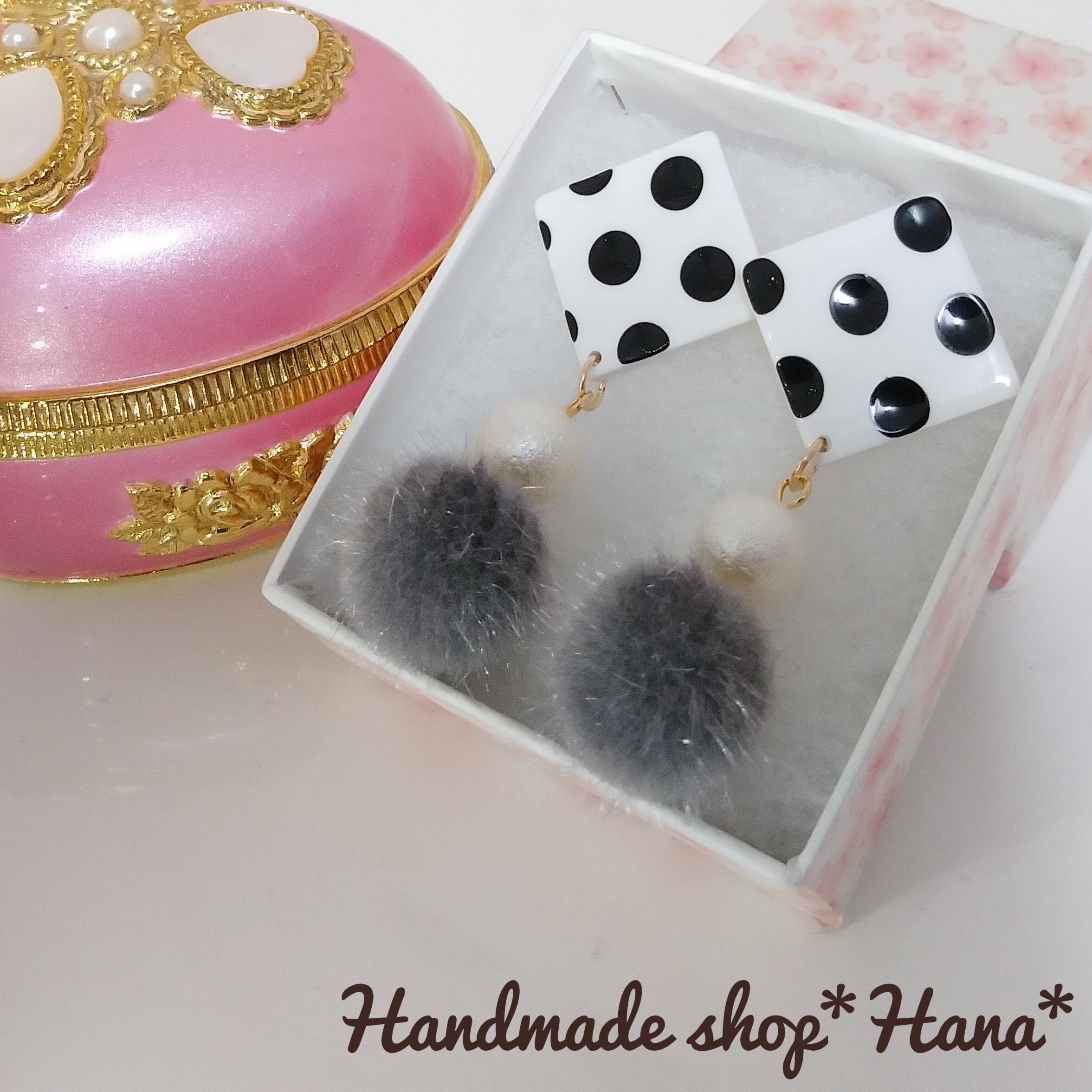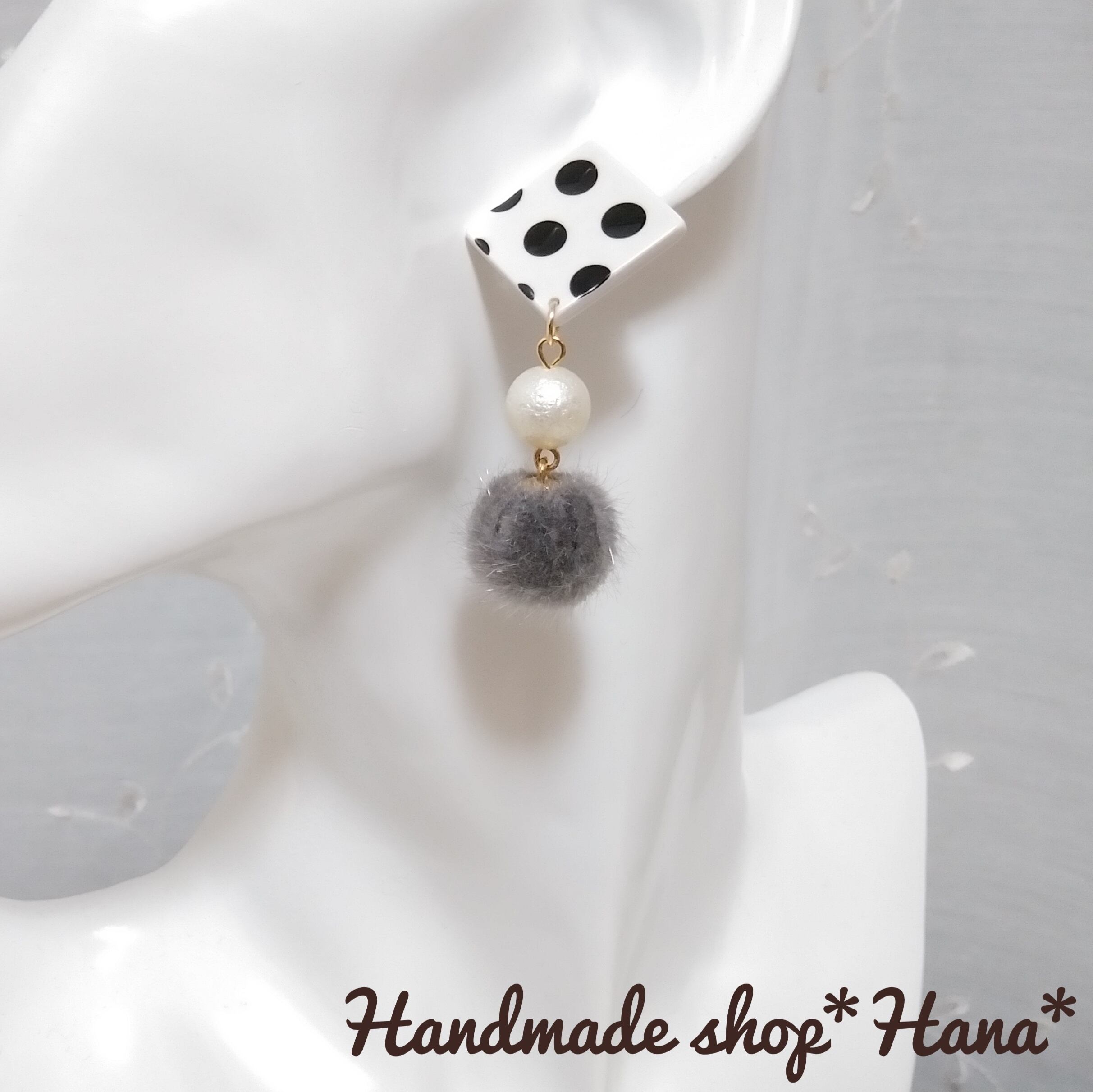 水玉とシュガーパール、ファーの相性が抜群にいい大ぶりのピアスです!